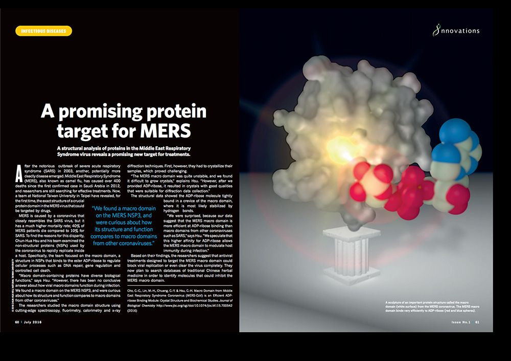 KAIMRC innovations報導臺大徐駿森教授團隊解析中東呼吸症候群冠狀病毒之蛋白質結構有藥物開發潛力,農業化學系/基因體與系統生物學位學程/系統生物學中心徐駿森教授團隊利用結構生物學與生物物理方法,解析在中東呼吸症候群冠狀病毒(MERS-CoV)基因體中會結合磷酸二腺苷核糖(ADP-ribose)的蛋白質模組之三維結構,可望成為發展新藥的潛力標靶。該研究已發表於2016年的「Journal of Biological Chemistry, 生物化學期刊」,並被沙烏地阿拉伯阿布都拉國王國際醫學研究中心(King Abdullah International Medical Research Center, KAIMRC)發行之國際雜誌KAIMRC innovations (Nature Publishing Group)與網站以International Research Highlight採訪報導。