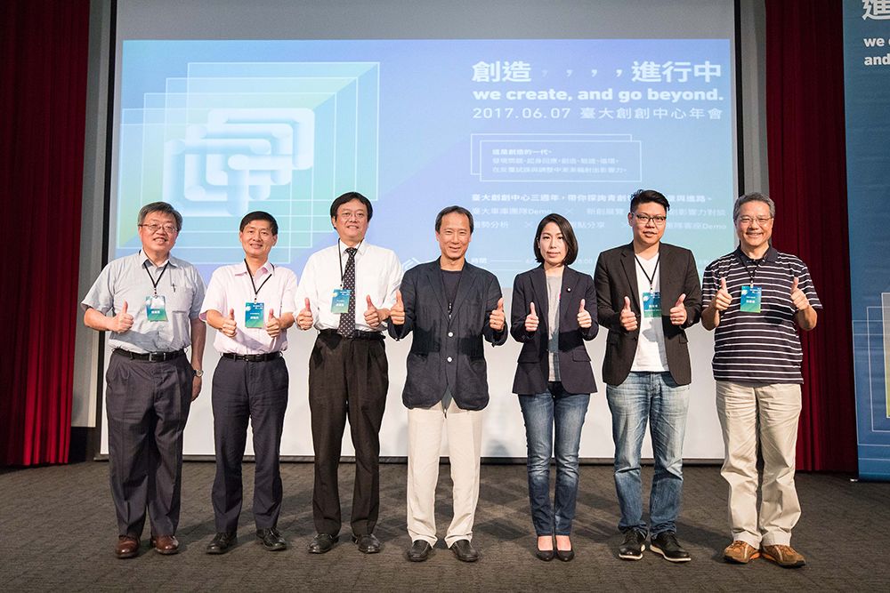 臺大創創中心三週年,校內外貴賓齊聚年會。左起:臺大電資學院陳銘憲院長、臺大管理學院郭瑞祥院長、臺大社科學院蘇國賢院長、臺大創創中心李吉仁主任、立法委員余宛如女士、綠藤生機共同創辦人鄭涵睿執行長、訊連科技黃肇雄董事長。