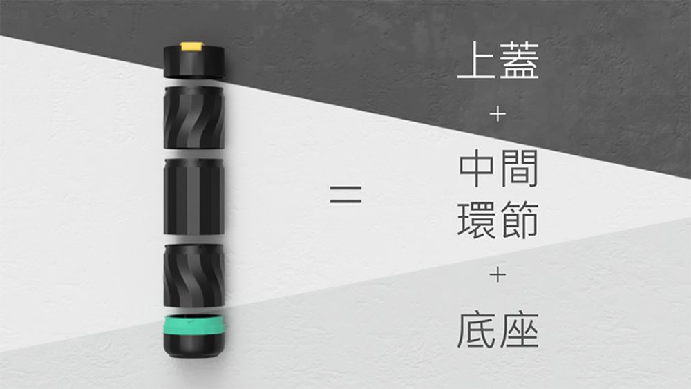 Wattle將水壺變成個人化用品,打破所有限制,將水壺分解成上蓋、瓶身環節及底座(如上圖)。透過統一的專利卡榫, 連接各個不同顏色與紋路的環節,創造出獨一無二的個人化水壺。此外,卡榫有別於傳統螺紋,不僅能降低藏汙納垢的可能,更能一秒緊鎖,並提供旋轉反饋,讓環保更時尚、簡單。