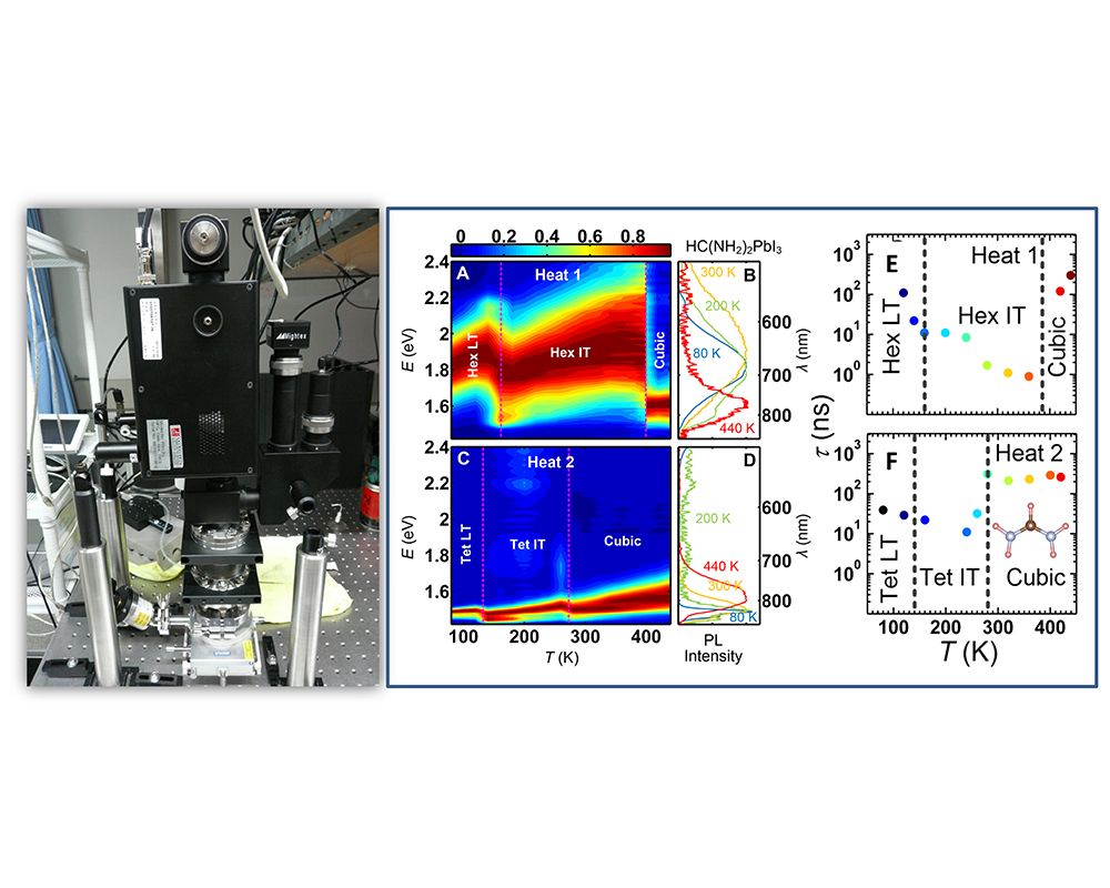 (左) 由臺灣團隊自製的可變溫式雷射掃描共軛焦光譜顯微鏡;(右) 在兩種不同的加熱路徑下,FAPbI3之變溫螢光光譜(A-D)及時間解析螢光生命期(E、F),當FAPbI3轉變為立方晶相,均可觀察到螢光生命期顯著增長。