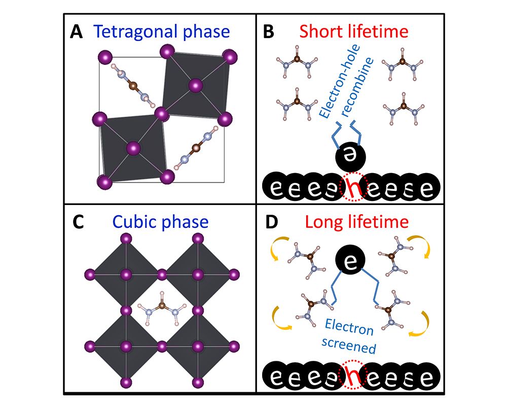圖二:有機分子的電荷屏蔽效應有效地延長光激電子的生命期,增強鈣鈦礦太陽能電池的能量轉換效率。 (A、B):當FAPbI3是四方晶相,FA+離子不能自由旋轉,無法有效地屏蔽光激電子與電洞的再複合機制; (C、D):當FAPbI3是立方晶相,FA+離子能自由地旋轉,因此對光激發電子產生極佳的電荷屏蔽效應。