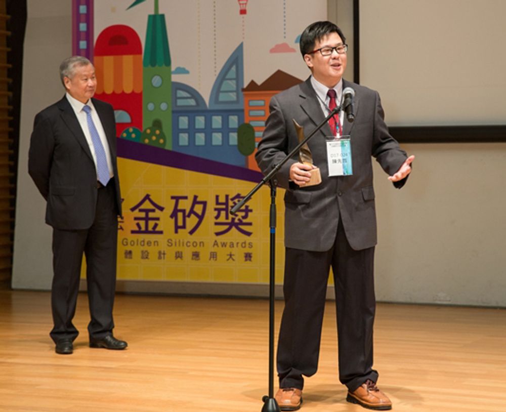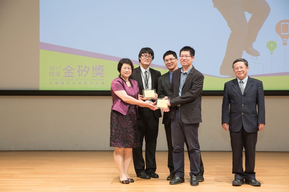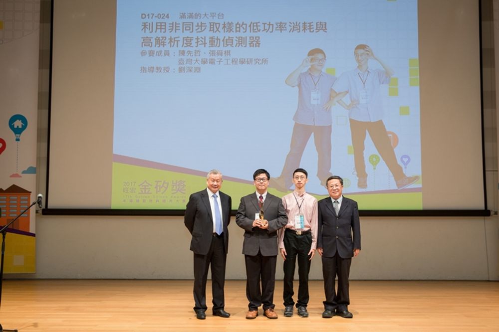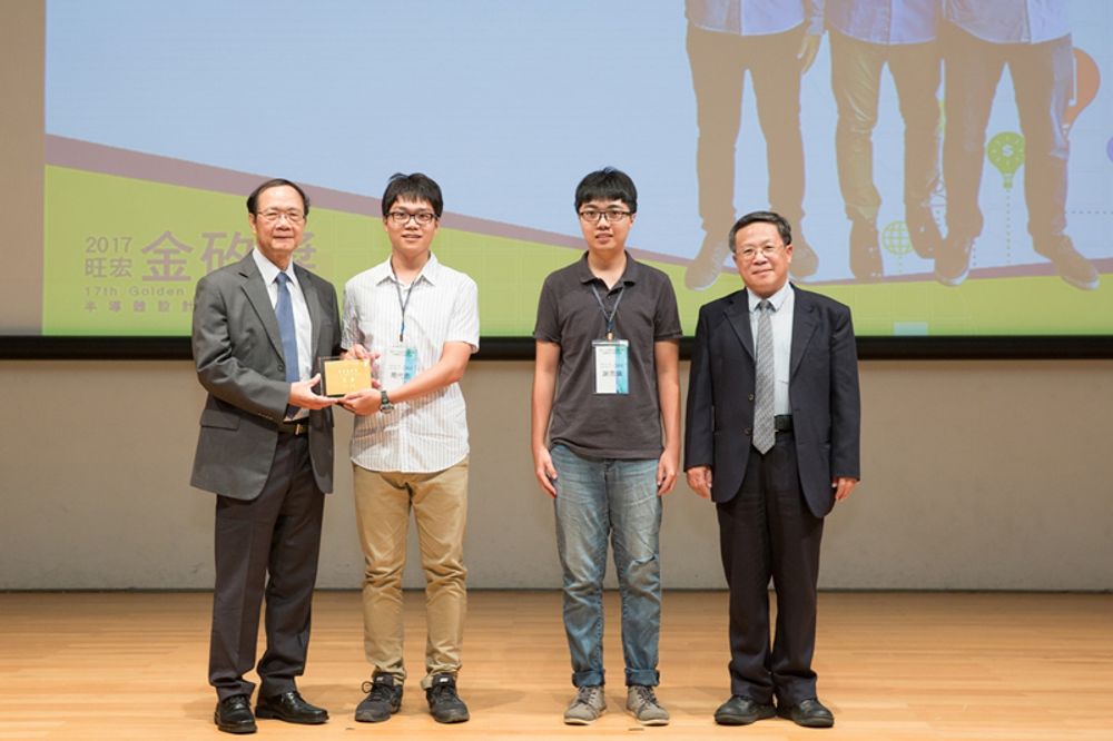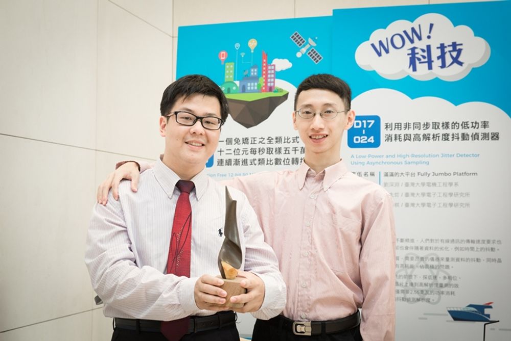 全國大專院校最重要的半導體競賽—第十七屆「旺宏金矽獎—半導體設計與應用大賽」7/16舉行頒獎典禮,設計組金獎由臺灣大學陳先哲、張舜棋團隊獲得,作品「利用非同步取樣的低功率消耗與高解析度抖動偵測器」,研究以低速、多相位、非同步取樣的方式,解決資料因高速傳輸伴隨的劣化問題,在晶片上達到高解析度量測的效果。