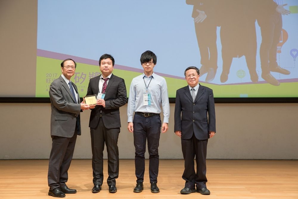 旺宏教育基金會吳敏求董事長頒發設計組評審團金獎予臺灣大學陳先哲等同學,臺大張慶瑞代理校長上台同享榮耀