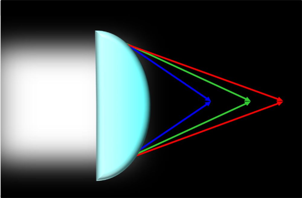一般透鏡有色散的性質,焦距會隨著入射光波長的改變而變化,且整體尺寸略顯厚重