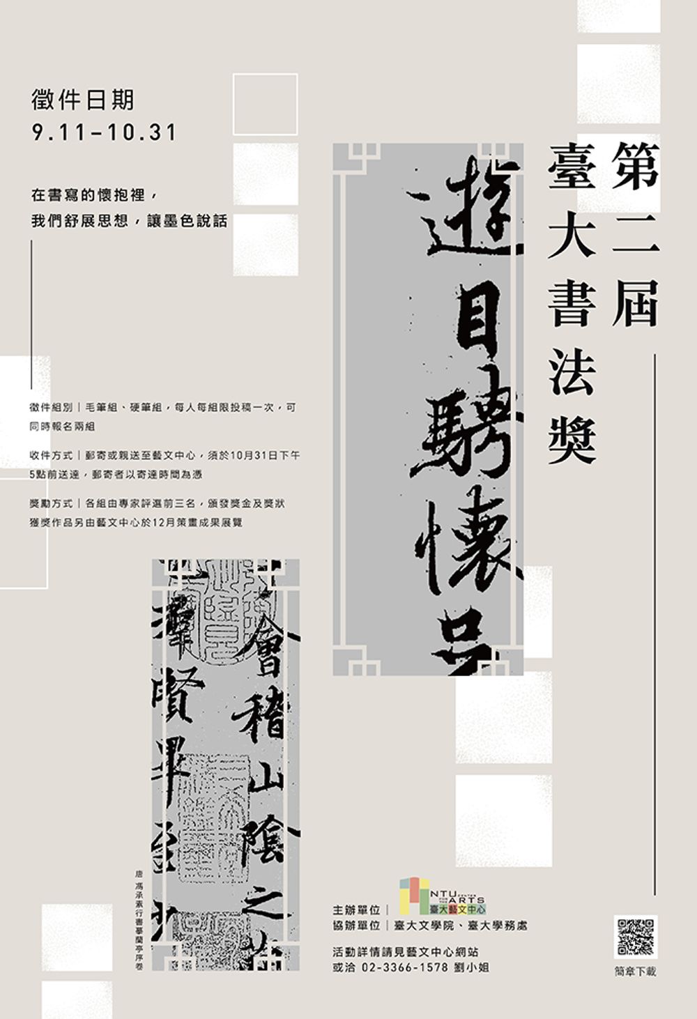 第二屆臺大書法獎熱烈開跑,即日起徵件至10月31日止,凡本校學生皆可投稿參加。徵件類別分為毛筆書法、硬筆書法兩組,各組將由評審評選前三名,頒發獎金與獎狀,獲獎作品將由主辦單位策劃成果展覽。