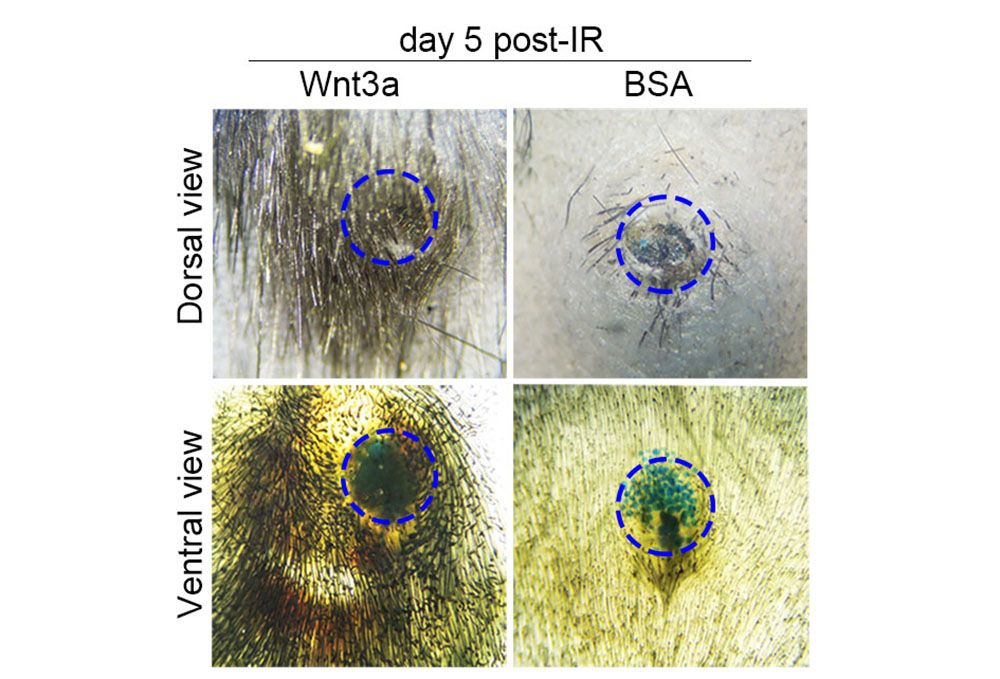 圖一:左側顯示利用Wnt3a局部施打,在放射線治療後,毛髮可以持續生長。右側為對照組,在放射線治療後毛髮嚴重脫落。
