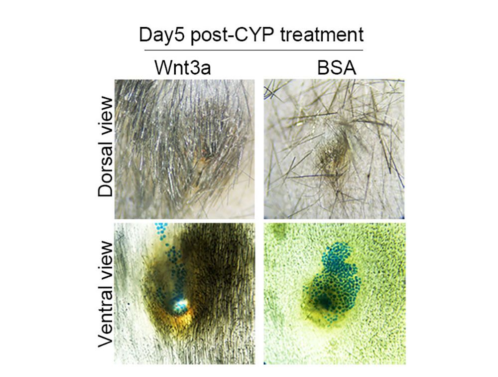 圖二:左側顯示利用Wnt3a局部施打,在化療藥物cyclophosphamide (CYP)治療後,毛髮可以持續生長。右側為對照組,在放療藥物cyclophosphamide (CYP) 治療後,毛髮嚴重脫落。