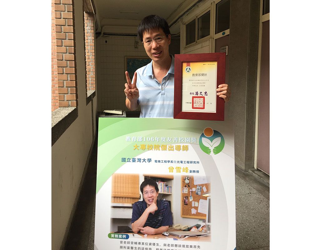 106年傑出導師共12人獲獎,其中國立臺灣大學電機工程學系曾雪峰副教授為臺大創校以來第一位獲獎人。秉持「伴你逐夢」之教育理念,超越傳統班級定位舉辦跨科系大型活動,讓學生看見電機系外的世界。曾副教授「終身導師」角色觸及職涯與生活範疇,兼顧專業教學與研究,突破傳統大學班導框架,實踐了高等教育之發展性輔導,鼓勵臺大人莫忘初衷,成為影響社會的正向力量。