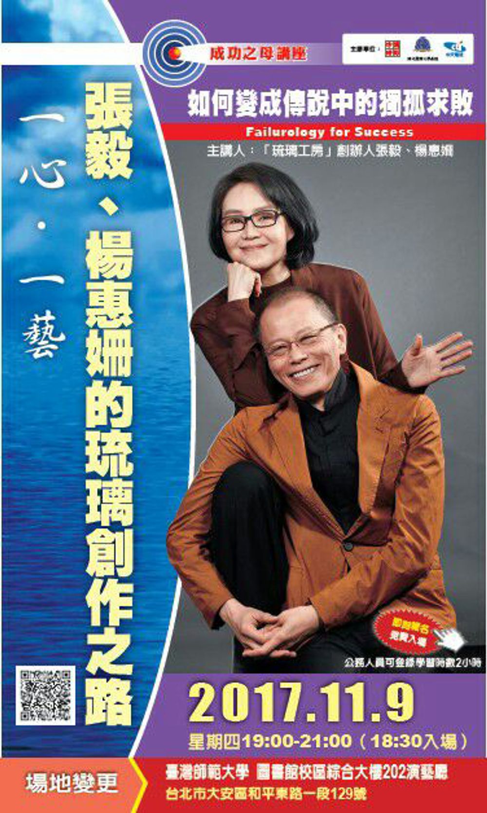 失敗為成功之母,成功榮耀的光環來自之前無數次的挑戰與挫折、困境正面迎戰!為引領年輕學子與社會大眾學習失敗、探索成功之道,國立臺灣大學系統與中國時報聯合主辦系列「成功之母講座」,第十一場邀請到「琉璃工房」創辦人張毅與楊惠姍,闡釋「一心.一藝 張毅、楊惠姍的琉璃創作之路」,分享與「琉璃工房」相伴30年的歷程,精彩的主題,絕對不容錯過!