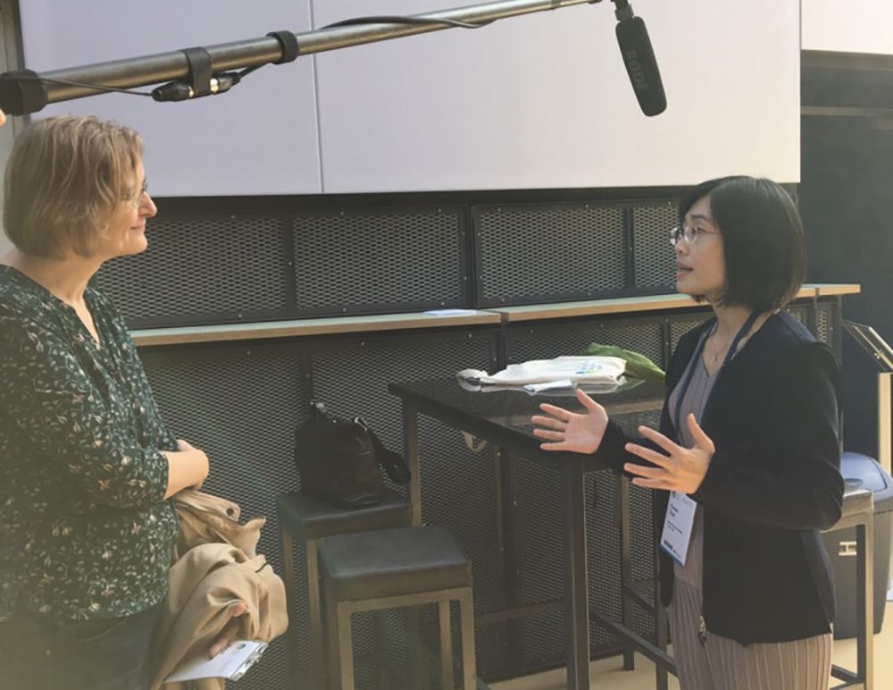 (圖六) 臺大公衛學院陳雅美副教授接受大會專訪,陳述WHS對臺灣公共衛生發展的重要性。