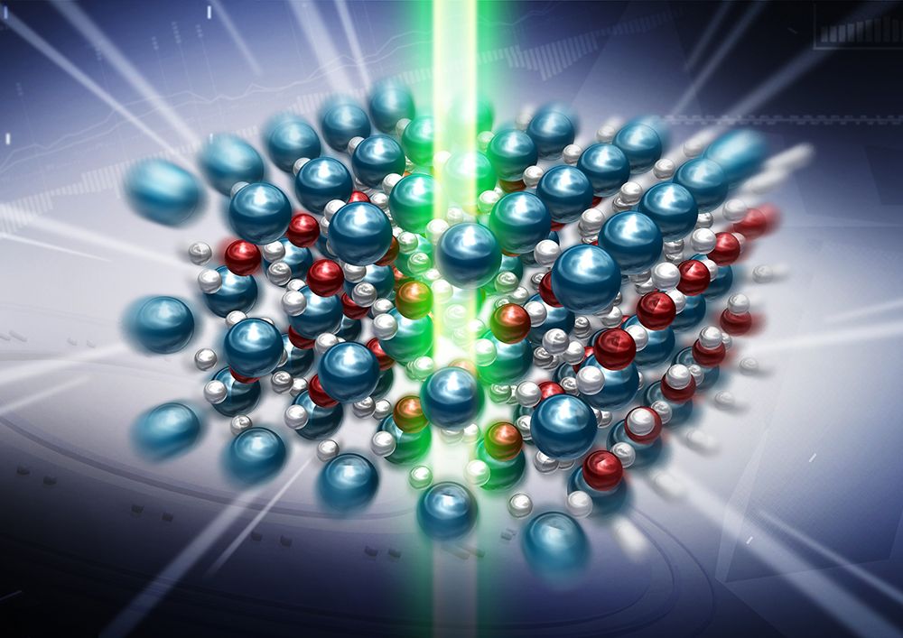 釕酸鍶受光照射而造成物理尺度變化之示意圖,光照材料後藉由能量轉換造成晶格改變。