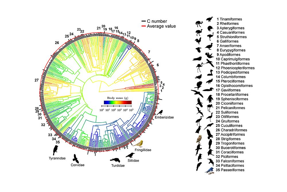 416種鳥類的譜系圖。圓心為現代鳥類的共祖,距今約為1億多年前,圓周上每個黑色線條代表一個物種,圓心到圓周的分岔代表演化過程的分化。黑色線條的長度為C number(線性尺度)、分岔線條的顏色代表鳥重(對數尺度),紅圈為 C number 的平均值。