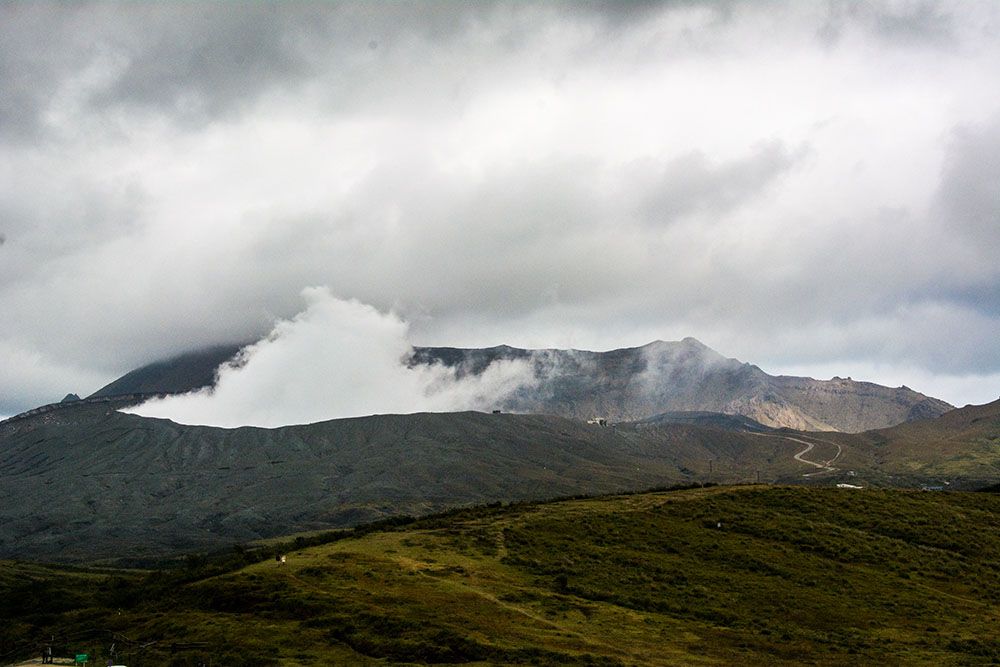 在阿蘇火山的部份,我們參觀了阿蘇火山博物館,裡頭陳列了日本活火山的岩石標本與模型,在京都大學研究員-黃有志博士的帶領介紹下,我們一行人對於阿蘇火山的噴發歷史與地質意義更加了解。熊本地震時,造成阿蘇火山臼內崩塌發生,位置多位於山頂或山腰間,與河流侵蝕引起的崩塌地分布有明顯的差異,崩塌造成底部紅棕色的火成岩露出與植被形成強烈對比。熊本地震在阿蘇火山臼內造成數條正斷層,地表拉張形成地塹帶,連帶造成房屋倒塌,過了一年後,依然可見到道路塌陷的痕跡,不過鄰近的農田大多以覆土的方式逐漸恢復中。