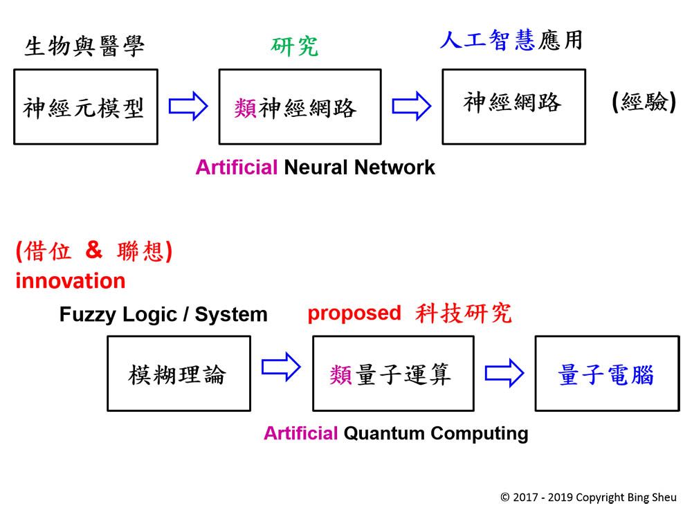附圖一詳細地顯示這兩者的關聯性。在過去的人工智慧發展的經驗裡,研究人員從生物與醫學領域的人類神經元模型出發,在1980年代發展出「類神經網路」的研究。整個研究持續進展到2010年代,神經網路的使用成為人工智慧的深度學習的主力。因此,我們可以經由借位(innovation)與聯想,把原有的模糊理論(fuzzy logic & system)研究,進一步擴展為「類量子運算」(artificial quantum computing)的架構,來做為邁向真正量子電腦的最佳過渡。