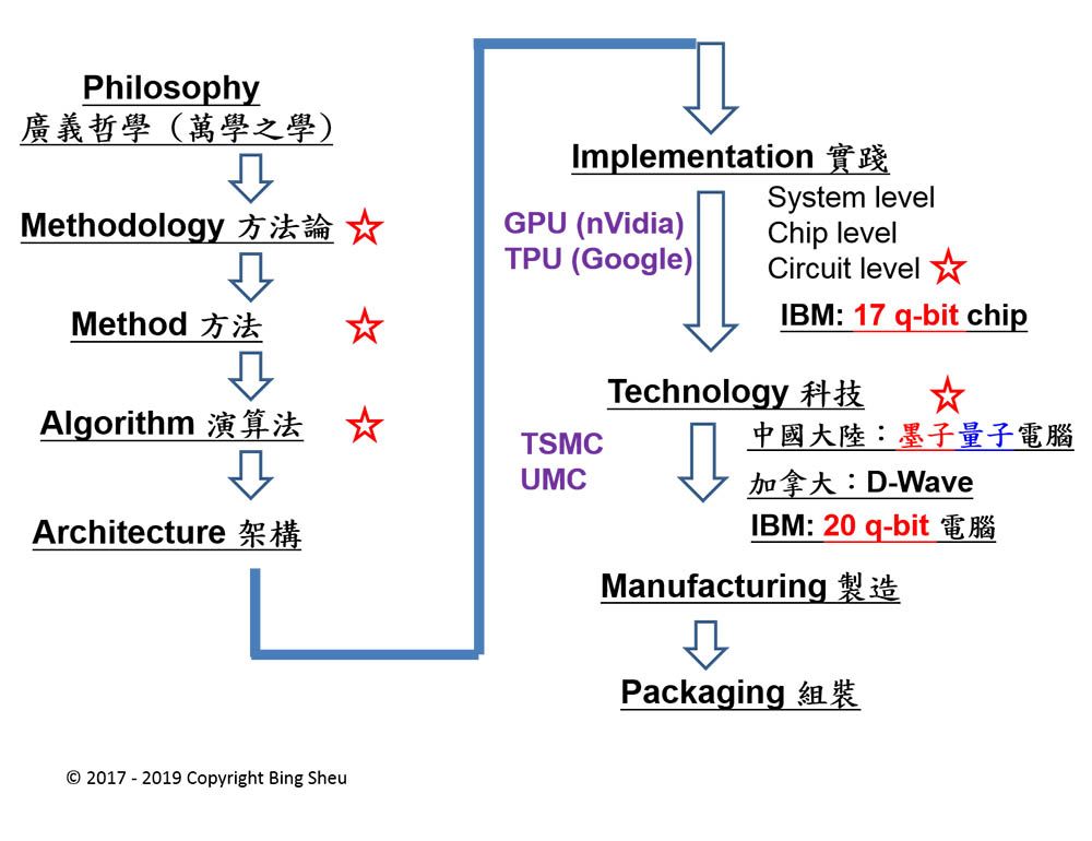 圖二:高階的人工智慧,以「類量子運算」做為電子電腦到量子電腦的過渡。晶片設計的系統化流程。
