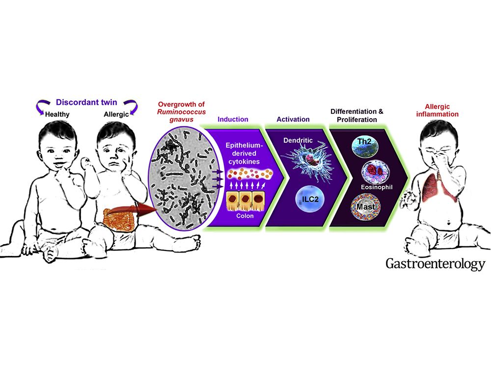 在4年研究期間,其中20名幼童(45.5%,20/44)出現過敏性疾病。我們在過敏幼童的糞便中檢測到屬毛螺旋菌科(Lachnospiraceae)的瘤胃球菌(Ruminococcus gnavus)過度生長,顯著高出健康的控制組幼童(p < 0.004)。此現象在患者2個月大時即出現,並持續增長到1歲。在過敏病症出現前,已可觀察到R gnavus在糞便檢體中飆長。簡言之,R gnavus在個體腸道中定殖(Colonization)過早(1歲以前,健康幼童大約2歲以後此菌方會定殖)或此菌繁殖過盛,終將致使兒童罹患過敏性疾病,尤其是呼吸道過敏。