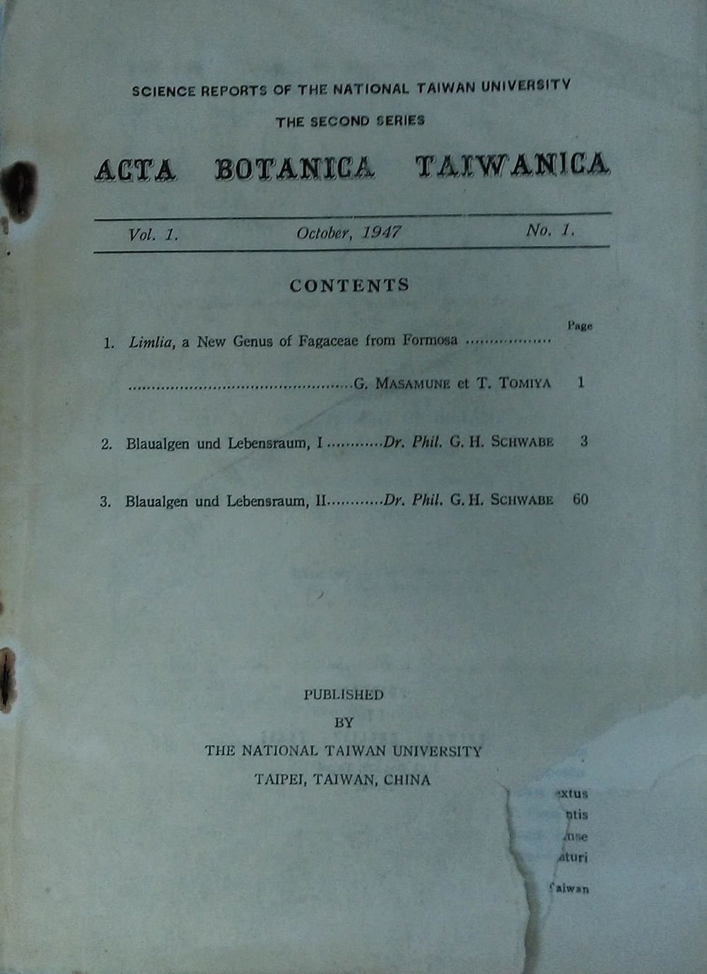 1947年10月印行的前刊封面,為一系列國立台灣大學理學院研究報告之第三種,刊名Acta Botanical Taiwanica,該刊僅出一期。