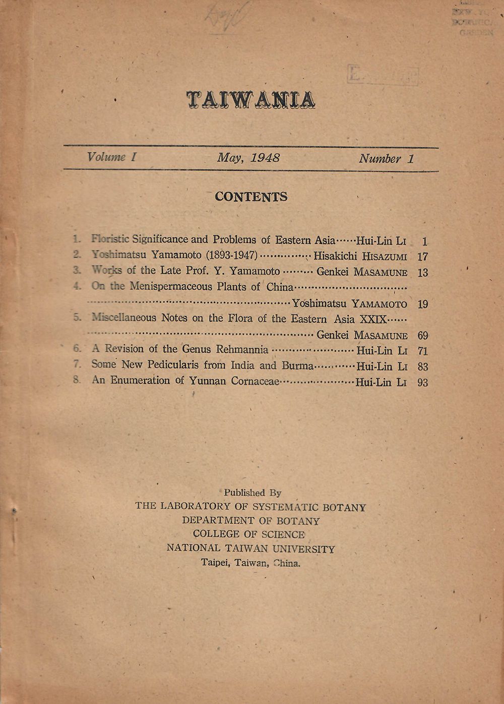 1948年植物系系統分類實驗室,新創 Taiwania 為名的期刊封面。1948-1_創刊內頁明白指出發刊宗旨,李惠林教授為編輯,與訂閱金額(時為舊台幣時期)。