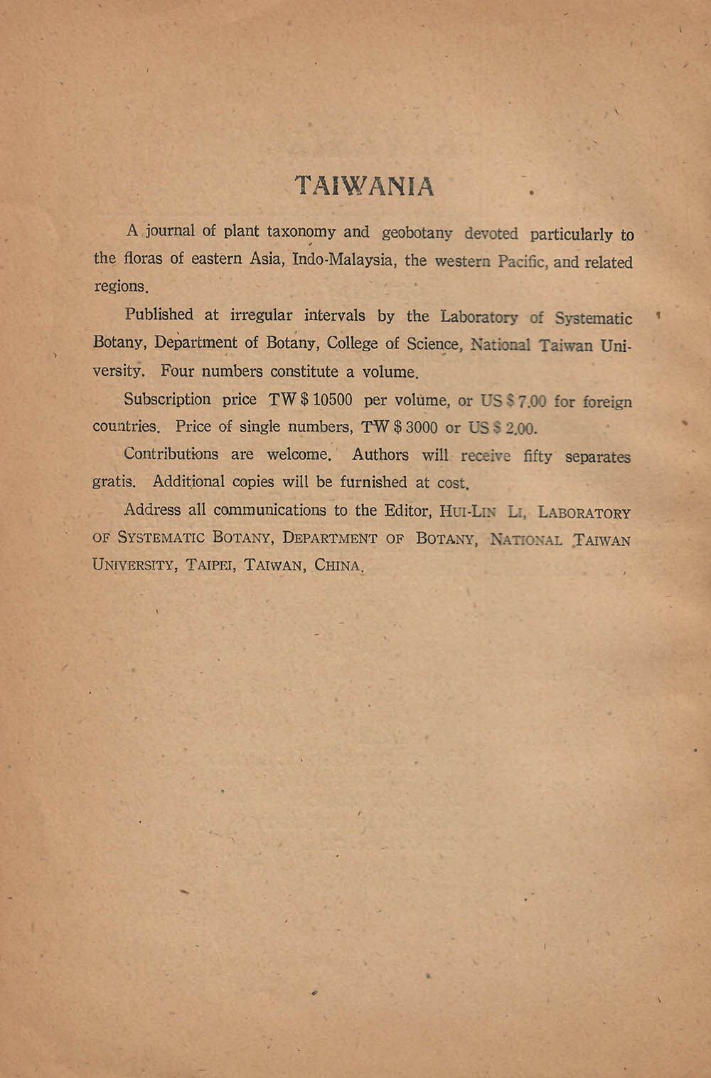 1948年植物系系統分類實驗室,新創 Taiwania 為名的期刊,內頁明白指出發刊宗旨,李惠林教授為編輯,與訂閱金額(時為舊台幣時期)。