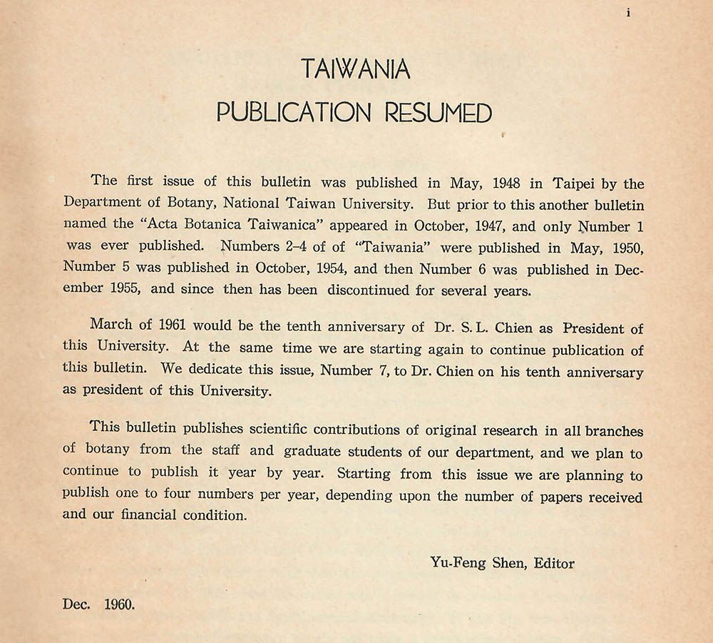 植物系沈毓鳳系主任,特別為文說明Taiwania 與 Acta Botanical Taiwanica 關係與卷期的延續,本卷為當時台大校長錢思亮就任12周年特刊。
