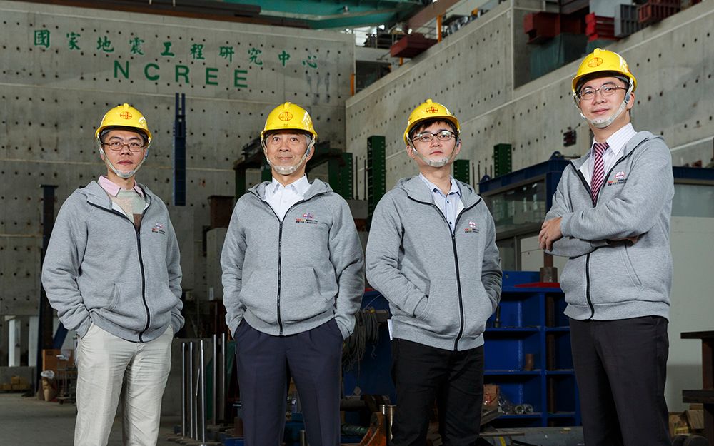 蔡克銓教授團隊鋼材韌性吸收地震能量,由左至右為王孔君、蔡克銓、吳安傑、莊明介。
