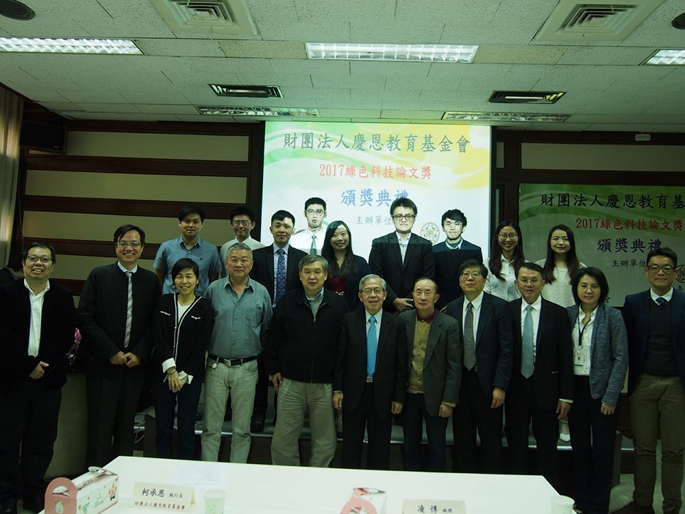 第五屆財團法人慶恩教育基金會綠色科技論文獎揭曉,柯承恩執行長、林惇經理、臺大王根樹總務長、朱明文組長及林正芳所長蒞臨致詞與頒獎,潘述元(臺大)、潘冠綸(中大)、邱宜亭(成大)三位博士獲得博士組論文獎,指導教授分別為蔣本基、張木彬、林財富,每位博士與其指導教授共獲新臺幣15萬元獎金;呂偉立(臺大)、馬緻宇(臺大)、甘瑋甄(臺大)、鄭嘉俊(成大)、劉成彬(成大)、姚彥丞(中大)六位碩士獲得碩士組論文獎,指導教授分別為劉雅瑄、侯嘉洪、劉雅瑄、林財富、黃良銘、江康鈺,每位碩士與其指導教授共獲新臺幣10萬元獎金。