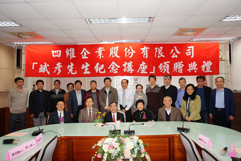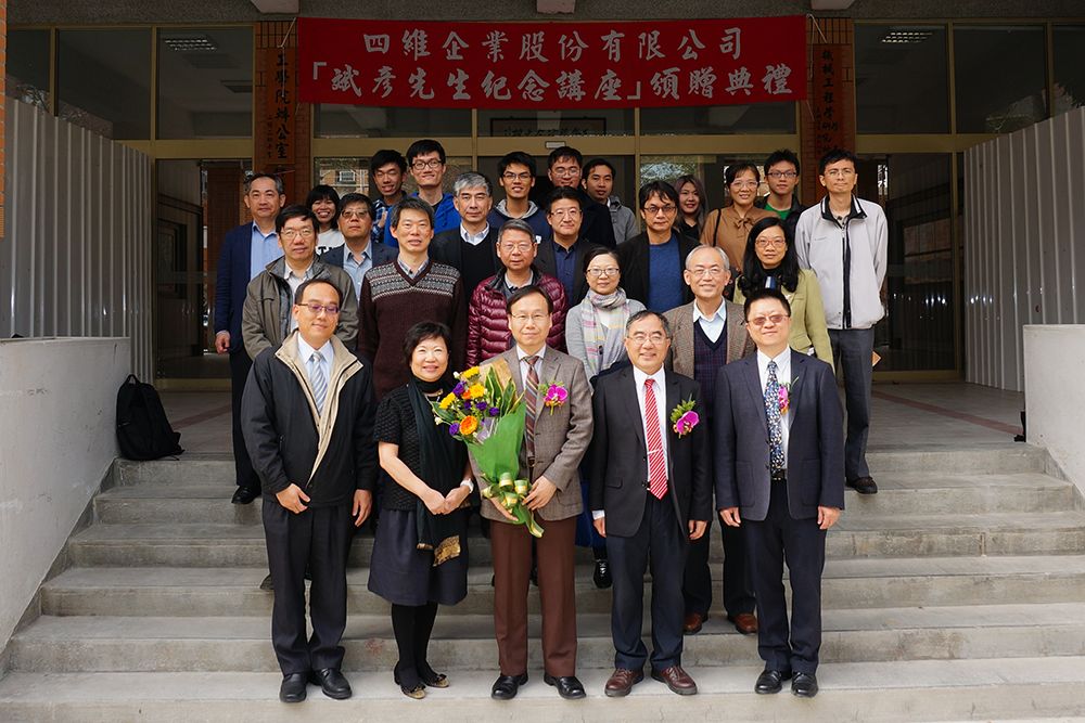 吳紀聖教授榮膺106學年度四維企業股份有限公司「斌彥先生紀念講座」,四維企業股份有限公司為提升本校工學院各工程科技領域之水準,鼓勵傑出學者專家引導高科技研發方向與應用,特設立斌彥先生紀念講座,以發揚學術典範及科技創新精神。捐贈單位每年提供一個名額,獲獎人每人每年獎金新臺幣三十萬元,講座任期三年,期滿可再重新接受推薦或評選;曾獲二屆本講座者,即成為終生榮譽,不再接受推薦或評選。本(106)學年度獲獎人為化工系吳紀聖教授。