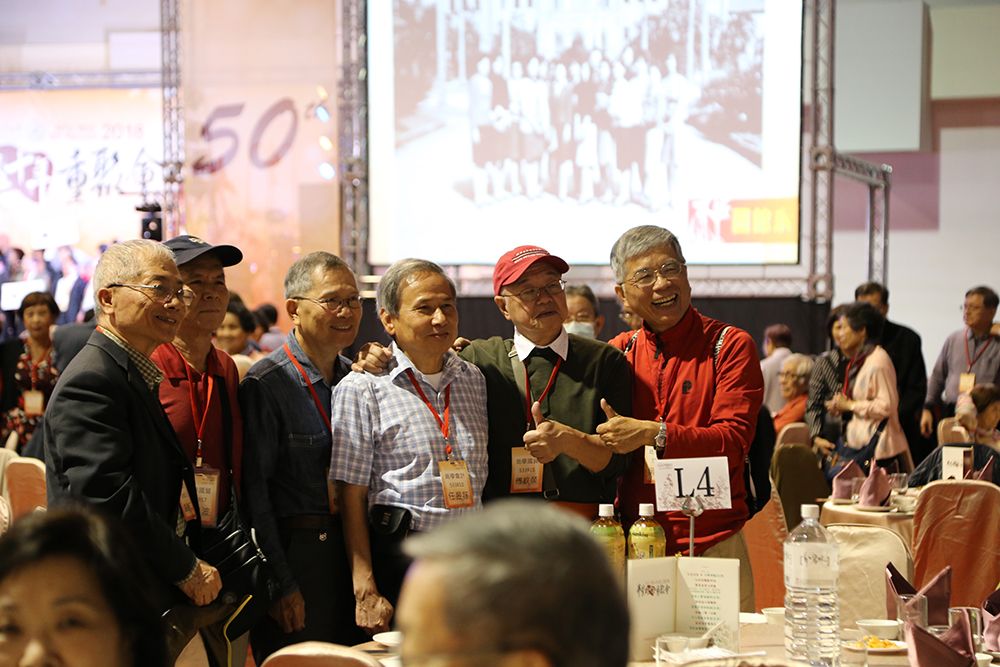 B53校友五十重聚席開80桌,場面浩大。除了畢業已久的校友外,還邀請到當年教授,22位教授皆年齡近90歲高齡,雖然已步伐蹣跚,但見到以往指導的學生,仍難掩興奮之情,大家一起重溫往日念書的情景,彷彿回到青春歲月。
