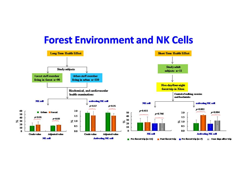 團隊邀請住在森林中工作的90名職員和住在臺北市的城市工作的110名職員,進行心血管健康、生化檢查及自然殺手細胞數量的檢測研究,希望瞭解長期的健康效益。結果顯示居住在森林環境中的自然殺手細胞百分比要比住在城市的高。證實在森林環境工作者,其血液中自然殺手細胞百分比明顯高於城市工作者。