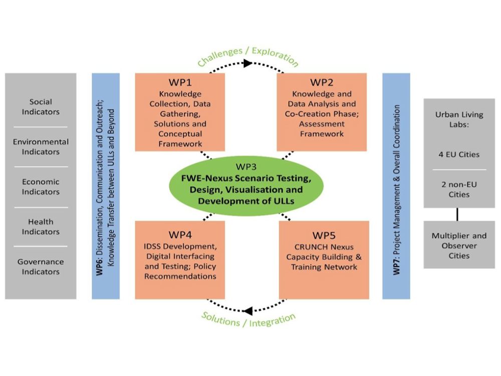 CRUNCH計畫目標為展示Food-Energy-Water (FEW) 鏈結如何強化都市面對各項環境壓力之韌性。預期將建立跨領域指標以作為系統評估框架,並據以建立緊密聯繫的知識平臺,期能發展一套整合決策支援系統 (Integrated Decision Support System, IDSS) 以輔助未來都市發展的決策。該計畫由7個工作模組(work packages, WP) 組成,內容架構如圖1所示。