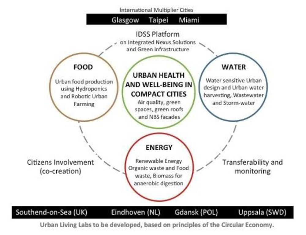 各國參與城市:Taipei (臺灣)、Southend-on-sea (英國)、Gdansk (波蘭)、Miami (美國)、Eindhoven (荷蘭)、及Uppsala (瑞典) 將各自選定都市內代表區域作為都市生活實驗室 (Urban Living Labs, ULLs);CRUNCH計畫將對 ULLs 進行共同設計,包括:釐清現況問題、擬訂可能解決方案等(圖2)。計畫核心為 WP3-情境測試 (scenario testing),即針對計畫中的六個城市共同設計解決方案;其餘計畫則圍繞此目的,包括:釐清各城市的具體挑戰、擬訂解決方案、發展決策支援工具及分析數據等。