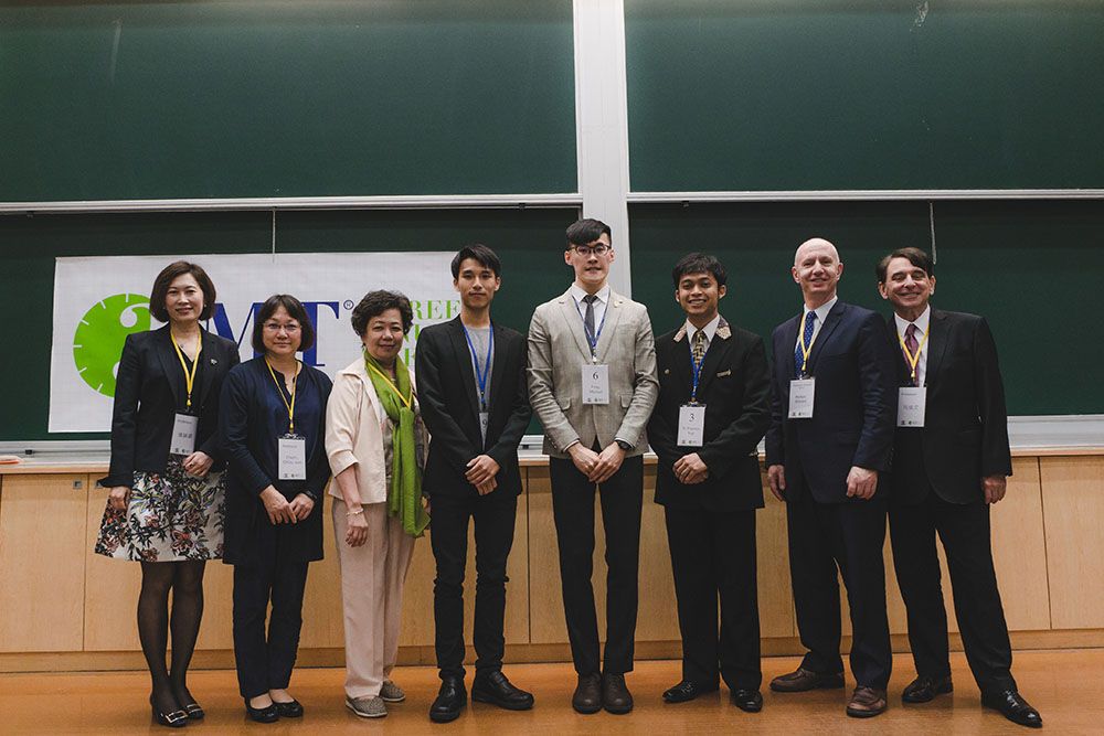 2018三分鐘英語學術簡報競賽(3MT)得獎者與評審,首獎得獎人:臺灣大學生化科學所馮聖富同學(左五),貳獎得獎人:臺灣大學機械所林晉毅同學(左四),參獎得獎人:臺灣科技大學工業管理所樂代義同學(右三)