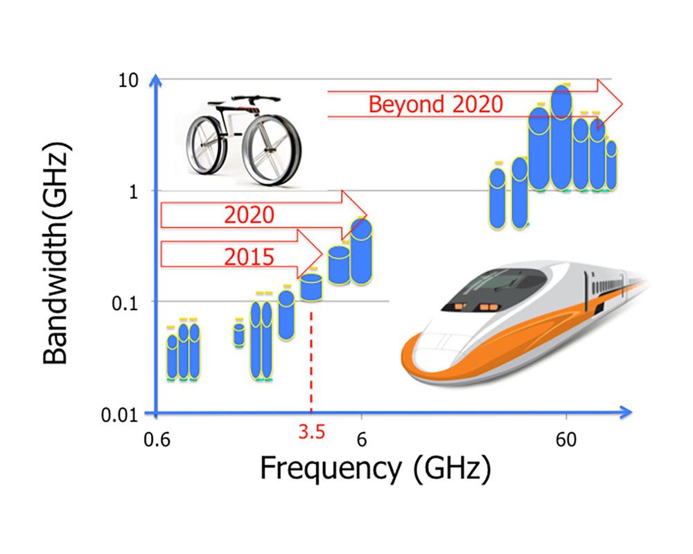 目前全球手機有一半以上都是智慧型手機,也就是大部份人都具備高速行動上網的配備,但是許多手機上網的愛用者仍然會抱怨尖峰時段的“龜速”感。其實手機上網就像開車上高速公路,原先使用900MHz的2G手機微波頻段,就像是在四十年前蓋的國道一號,其總頻寬實在太窄只有65MHz。未來的5G標準將使用的毫米波頻段(30GHz 至 300 GHz),可用的毫米波的頻寬是傳統微波的10倍至100倍。相當於我們在國道一號上方再加蓋了十座五楊高架,未來的5G行動通信,其毫米波可以使用的頻寬將是超過2000MHz(或是2GHz),甚至有些毫米波頻段可提供10GHz以上的可用頻寬。