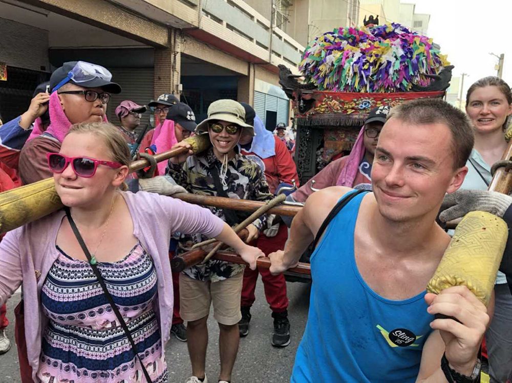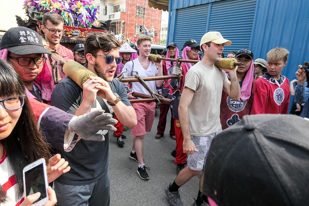 今年也特別感謝朝天宮廟方人員的協助,讓八名ICLP學生得以體驗「抬神轎」的工作。一般相信,轎班人員必須經過擲筊請示,獲得神明同意才可擔任,是許多臺灣人都不見得能得到的機會。ICLP學生能得此殊榮,或許也是媽祖娘娘對這群遠道而來的訪客表示歡迎、對國際學生的這場深度文化洗禮表示讚許吧。