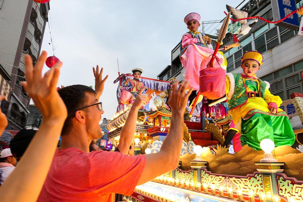 北港慶典知名的特色還有熱鬧精彩的陣頭演出,以及別出心裁的藝閣陣容。以歷史故事或神話傳說為題材,由小朋友著傳統裝束打扮成故事中人物,再結合充滿現代感的燈光效果與電子舞曲,讓現場的學生目不暇給,甚至情緒高昂地隨音樂起舞。藝閣上的小朋友看見朝他們熱情招手的外國友人,也大方撒下大把平安糖或零嘴、紀念品,讓學生更深刻感受走出課堂的學習實踐精神。