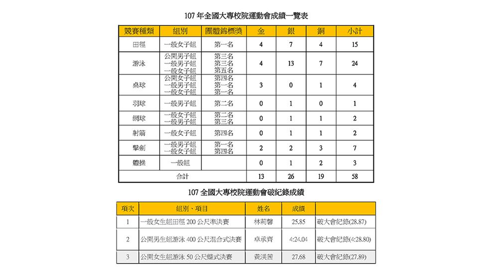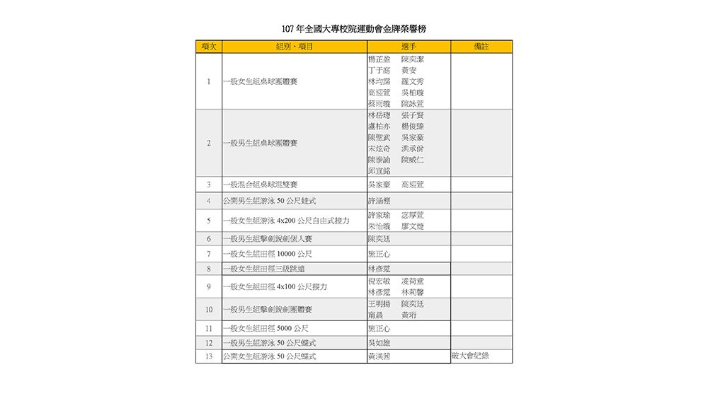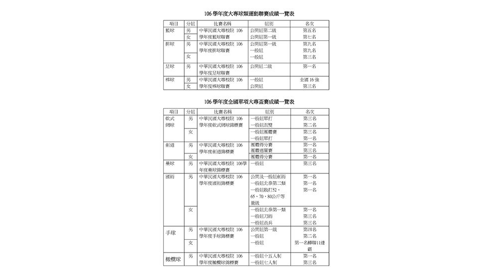 用餐過程中,除享用精緻的美食外,舞台兩側布幕也輪流播放著各隊精心製作用來感謝教練的影片,舞台下觀眾笑聲不斷。席間,各運動代表隊紛與師長合照留念,場面熱絡,歡笑聲不斷,頓時讓活動備感歡樂、溫馨。最後在抽獎活動後,106學年度運動代表隊聯合送舊晚會精采落幕。107年全大運及106學年度大專聯賽暨各單項大專盃競賽比賽成果如表列。