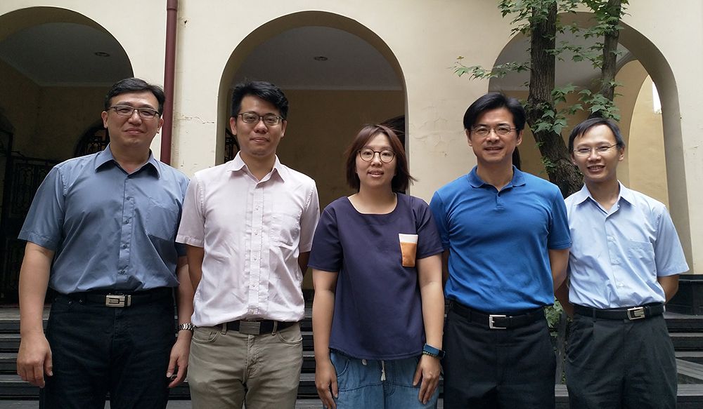 研究團隊,由左至右醫學院藥理所陳文彬副教授,生命科學系陳示國副教授,本文第一作者醫學工程學研究所范邁儀博士,醫學工程學研究所林頌然教授及臺大醫院神經科潘明楷助理教授
