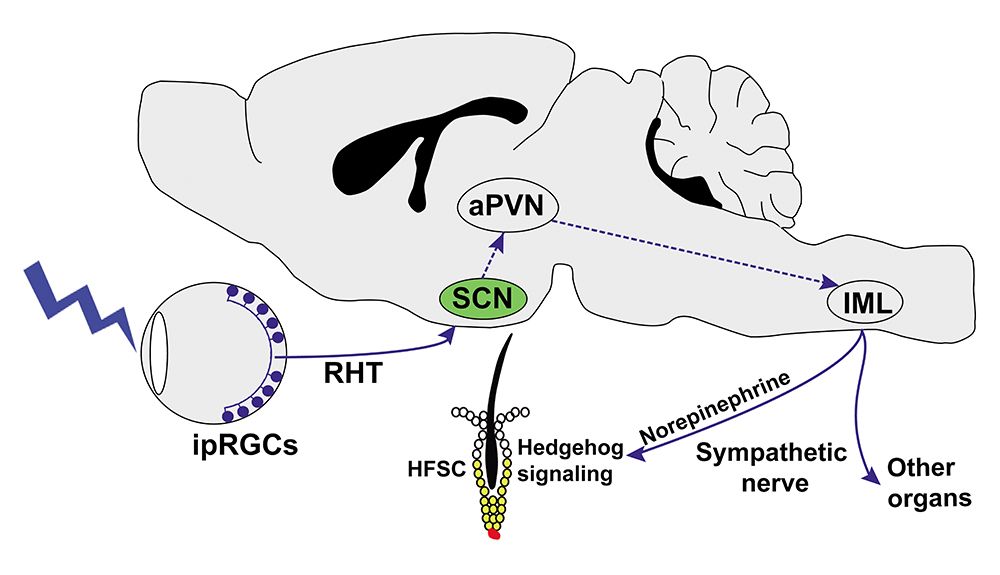 本研究發現讓小鼠每天暴露在強光(特別是藍光)數分鐘,可以活化毛囊幹細胞再生新髮。這是“視而不見”的生理感應, 並非經由錐狀與桿狀細胞這兩種與視覺成像相關的感光細胞所調控,而是利用視網膜內的內生感光視神經細胞作為受體,向視交叉上核發出訊號,隨後活化全身交感神經,致使皮膚中的去甲腎上腺素(norepinephrine)釋放增加,促進活化hedgehog signaling pathway,最後活化毛囊幹細胞。此反應並不影響原有的日夜生理週期。