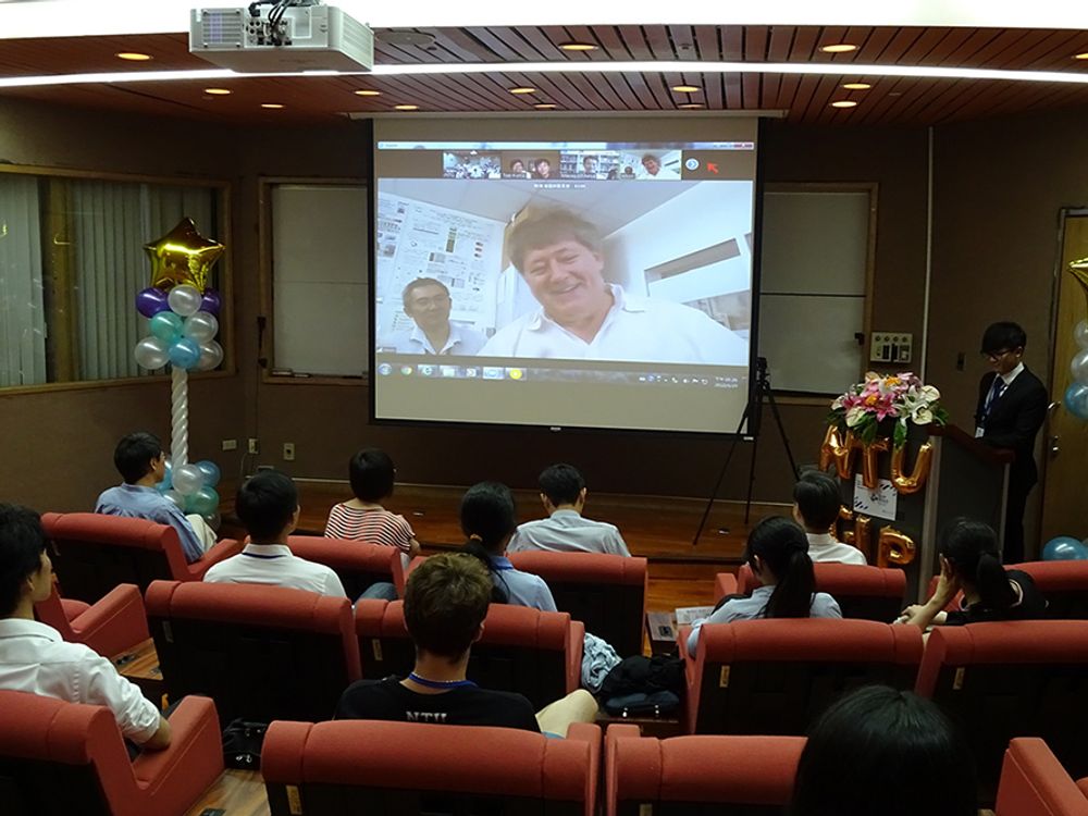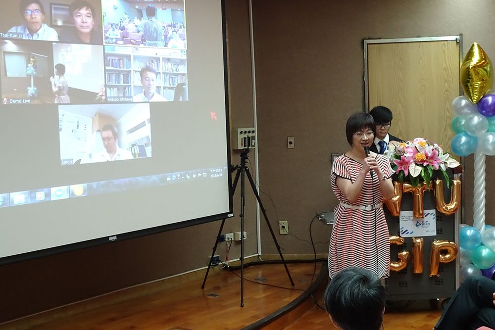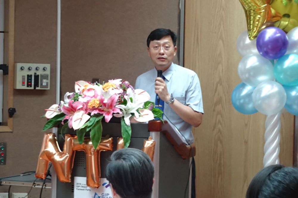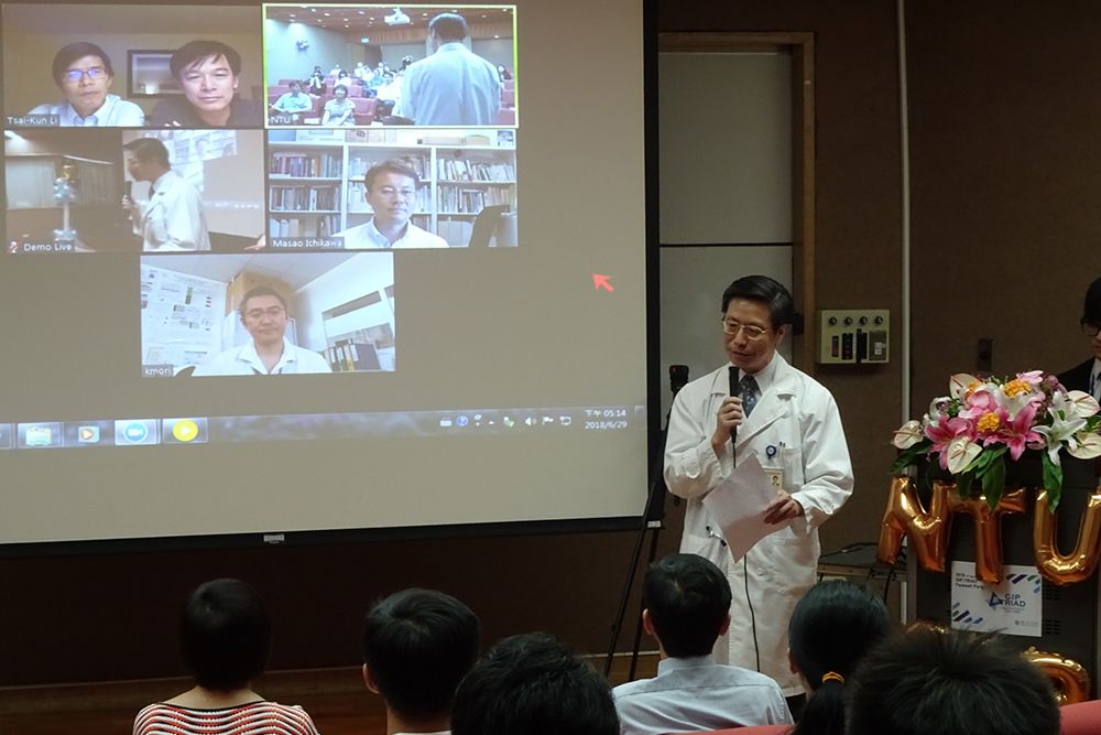 仲夏蟬鳴、夏荷盛開之際,GIP學生圓滿結束在臺大課程與相關在臺實習與研究,即將邁入第三學期,全體移至法國研修上課,亦是踏入另一個重要的里程碑。故本學程特於2018年6月29日(五)召開GIP-TRIAD歡送會(圖一),感謝校方大力支持。除郭大維校長、張淑英國際長、醫學院張上淳院長親臨致詞(圖二至四)外,筑波大學駐台辦公室主任Ryosuke Ohniwa教授與臺大GIP師長們亦蒞臨會場,同時,透過線上視訊連線在美的臺大GIP主任李財坤教授、三校聯盟夥伴日本筑波大學GIP代表Masao Ichikawa教授及法國波爾多大學GIP主任Dominique Rolin教授,來共享、共榮一場跨多國跨多校之國際性視訊聯合接棒活動。