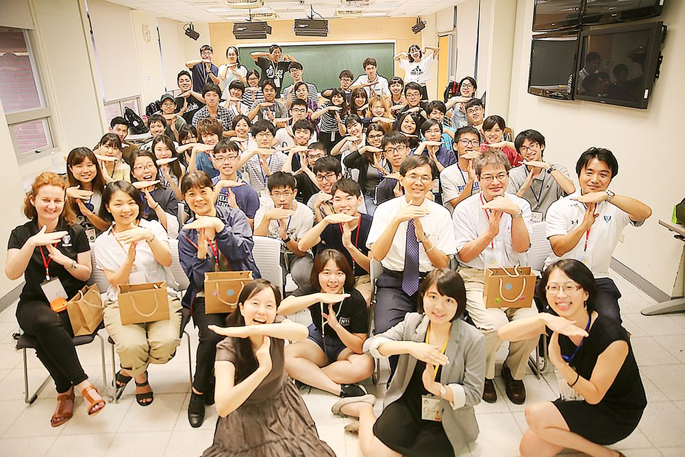 參與活動的師長同學以手勢表現臺大和筑波大學共有的符號-T