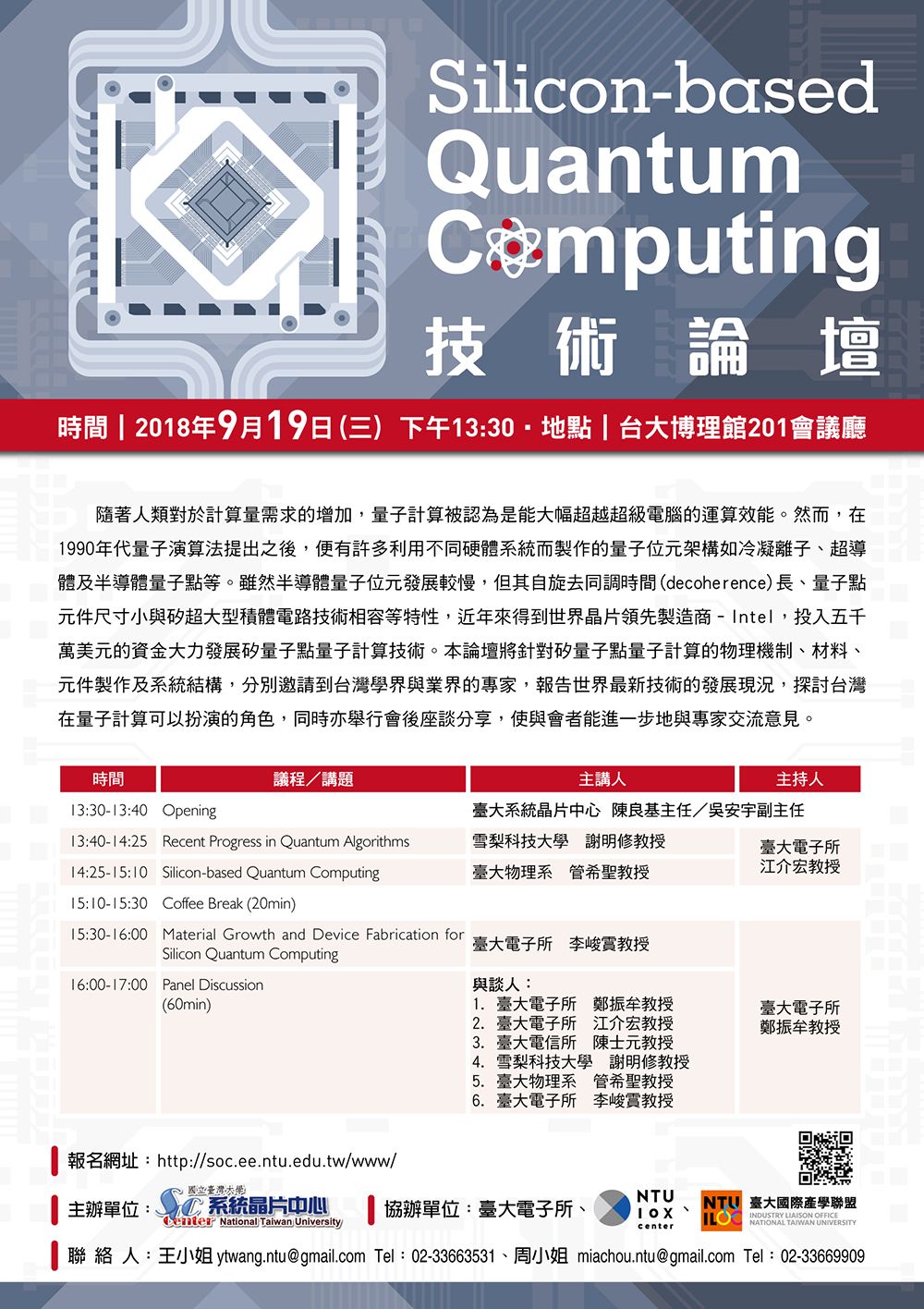 雖然半導體量子位元發展較慢,但其自旋去同調時間(decoherence)長、量子點元件尺寸小與矽超大型積體電路技術相容等特性,近年來得到世界晶片領先製造商–Intel,投入五千萬美元的資金大力發展矽量子點量子計算技術。本論壇將針對矽量子點量子計算的物理機制、材料、元件製作及系統結構,分別邀請到台灣學界與業界的專家,報告世界最新技術的發展現況,探討台灣在量子計算可以扮演的角色,同時亦舉行會後座談分享,使與會者能進一步地與專家交流意見。