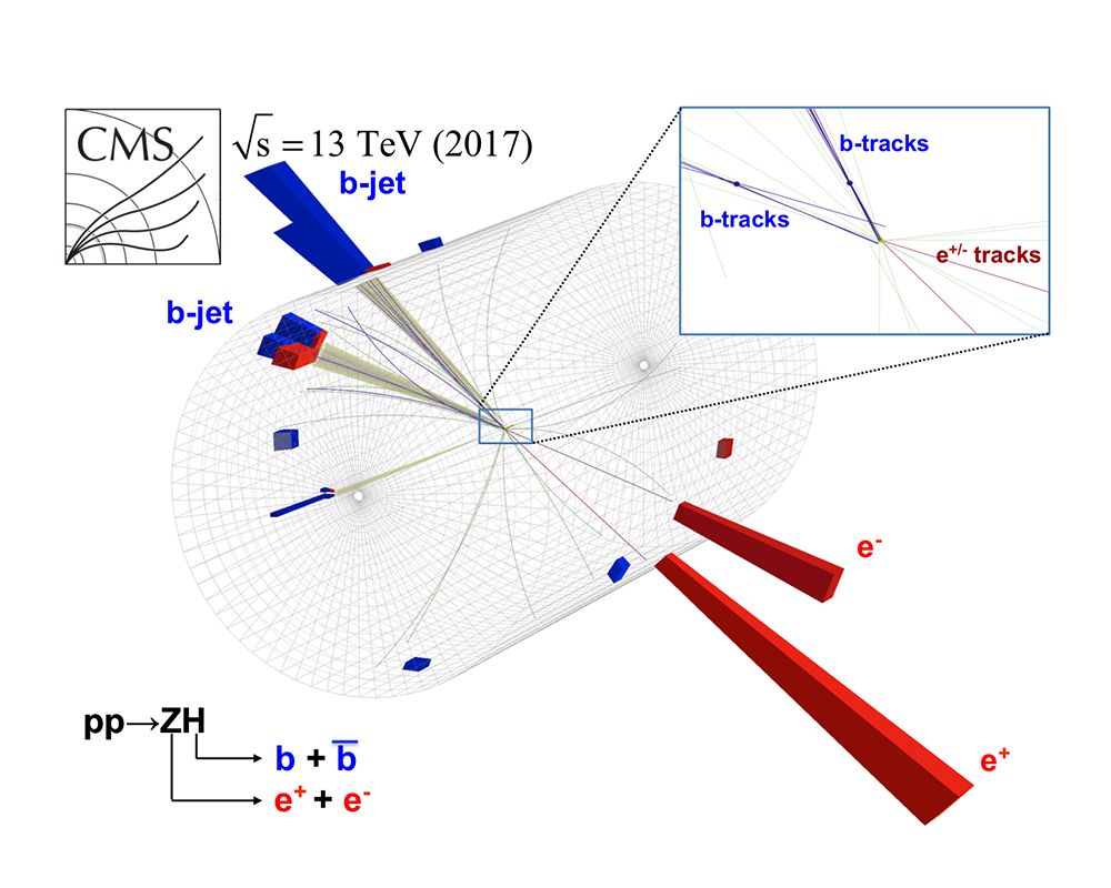 為此,CMS實驗正在積極推動偵測器第二階段升級計畫,臺大及中大高能實驗室在科技部及校方支持下也積極深入參與製作高粒度量能器。希格斯粒子與Z玻子協同產生事例,底–反底夸克對由希格斯粒子衰變而來,e+e‒正負電子對則由Z玻子衰變而來,是協助壓制背景的利器 。