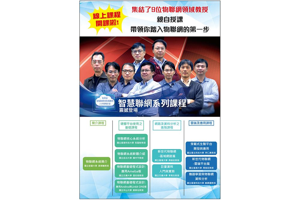 ●MOOCs線上開放式課程教材影片開發聯盟前期計畫中開發10門先行課程模組於今(107)年6月錄製完成一系列MOOCs線上開放式課程教材─智慧聯網系列課程。依照課程地圖劃分簡介課程、基礎課程、進階課程及應用課程。「物聯網系統簡介」為整個系列課程之簡介課程,在修其他課程前之必修課程。接下來在硬體平台使用之基礎課程之中,規畫了「物聯網核心系統分析」、「物聯網系統軟體介紹」、「物聯網基礎程式設計:應用Ameba板」、「物聯網基礎程式設計:應用Andino與LinkIt ONE板」四門課程,分別對不同平台進行介紹,修課學員可以從四門課中選擇二門來上,或是全上以獲得各式平台之知識。接下來的網路及資料分析之進階課程中,規畫了二門進階課程「新世代物聯網-區域網路篇」、「巨量資料入門與實務」,可提供修課學員包括中介軟體、作業系統、新興聯網技術之知識。最後,在雲端及應用課程之中,規畫了「穿戴式生醫平台開發與應用」、「新世代物聯網-雲端平台篇」以及「機器學習與物聯網資料分析」。