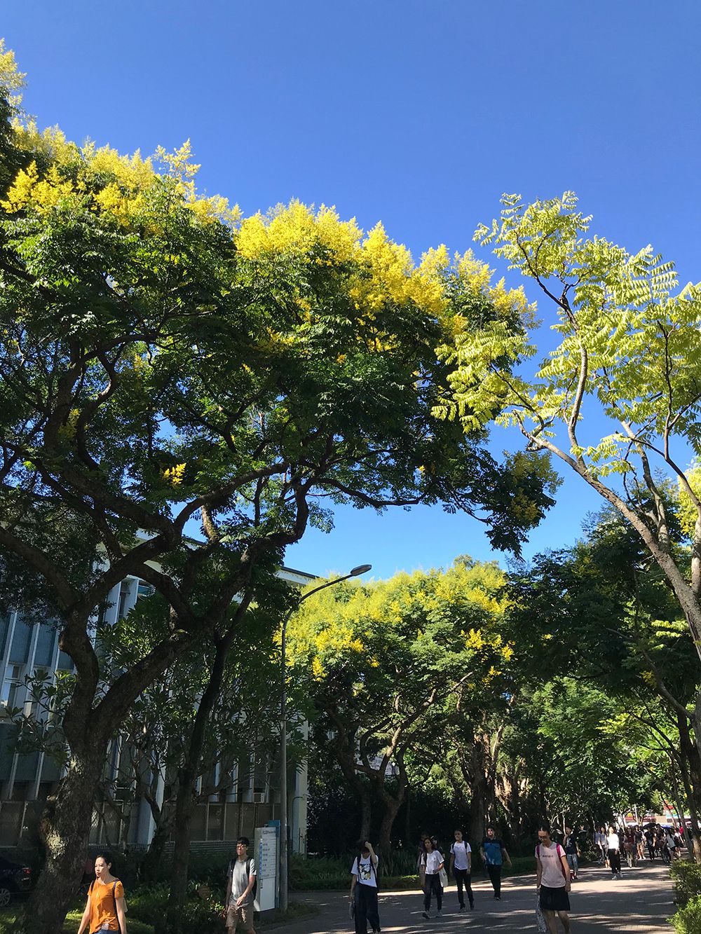 開學了!隨風落下的金色花瓣雨,好像在歡迎著同學們踏入校園一般!那正是擁有「黃金雨」美名的臺灣欒樹!每年約略中秋節之前,舟山路兩旁欒樹花海道,襯著秋日的湛藍天空,正是校園裡最美的秋天景色~趕緊把握時間,到校園裡散散步賞花去吧!