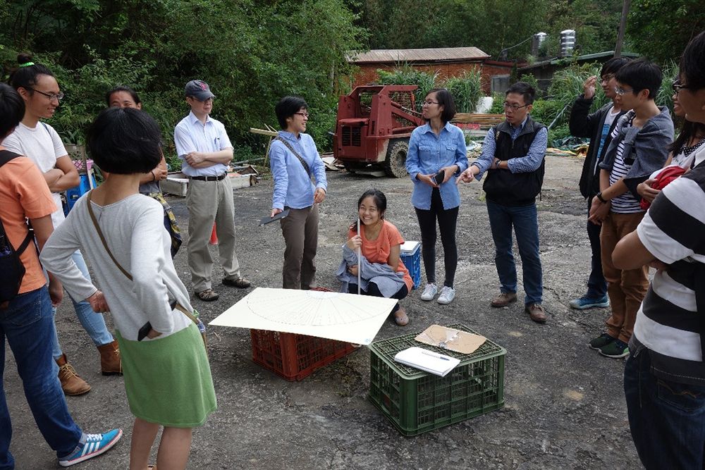 師生共同討論同學日晷作業,藉以了解坪林當地氣候陽光條件。