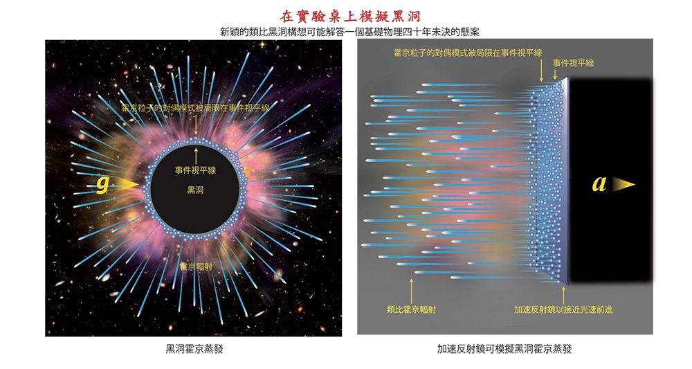 加速飛翔鏡可以模擬黑洞霍京蒸發。左:黑洞霍京輻射及其被困在黑洞事件視平線的對偶模式。右:一個加速的反射鏡也有視平線,也會輻射霍京粒子及困住對偶模式。兩者的相似性可以從愛因思坦的「等價原理」來理解。
