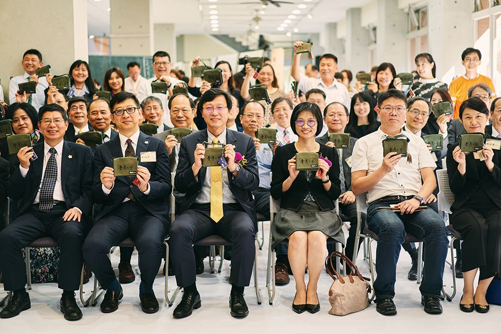 開幕佳賓一同舉起臺大小書包以及臺灣大學榜守合影留念。攝影:哲攝光