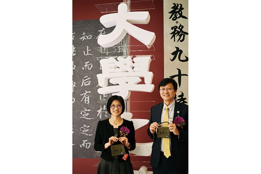 郭大維代理校長與廖婉君教務長為特展揭幕,並與展覽主題「大學之道」合照,期望培養臺大學生光明正大的品德,使臺大學生志向堅定、有所收穫。攝影:哲攝光