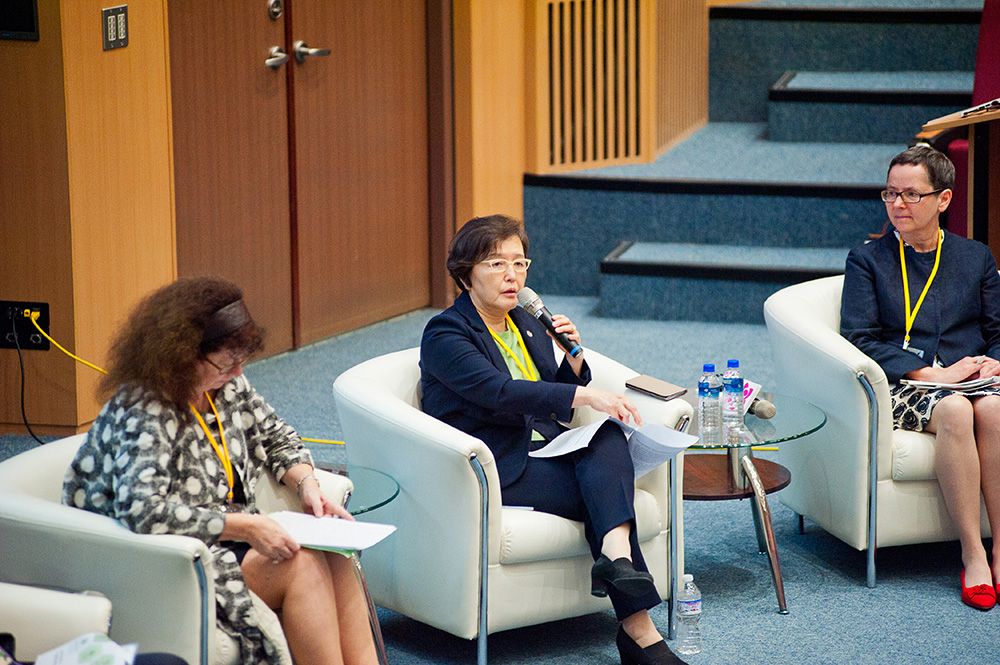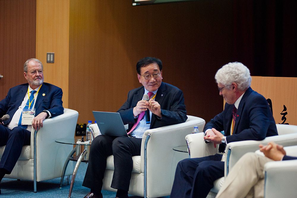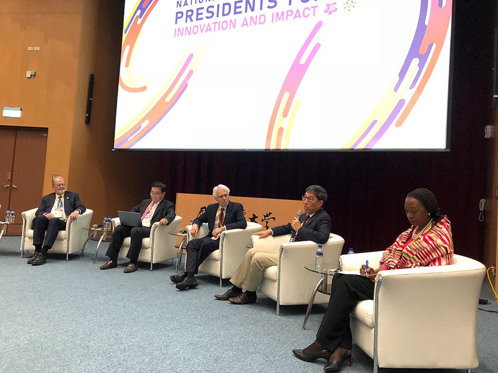 本次論壇分為兩部分,第一場主題為Innovative University Governance,邀請到伊利諾大學香檳分校Reitumetse Obakeng Mabokela副校長擔任引言人,講者則有香港城市大學郭位校長、加拿大西門菲沙大學Andrew Petter校長、韓國延世大學Kim Yong-Hak校長及沙迦美國大學Björn Kjerfve校長。幾位校長皆分享了對於高等教育及自身學校的定位,以及如何在高教資源縮減的情況下槓桿彼此的資源,透過合作完成單一學校無法完成的工作,如韓國延世大學校長Kim Yong-Hak分享該校如何與地緣相近的學術研究機構合作,透過共設實驗室等方式分享研究設備與資源,進行更尖端或跨領域的研究。