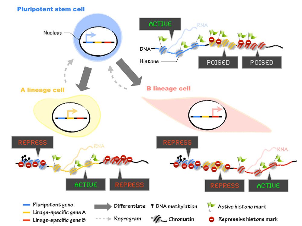 幹細胞分化與體細胞去分化過程中發育相關基因之表觀基因體變化示意圖